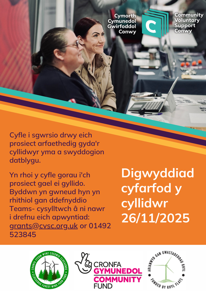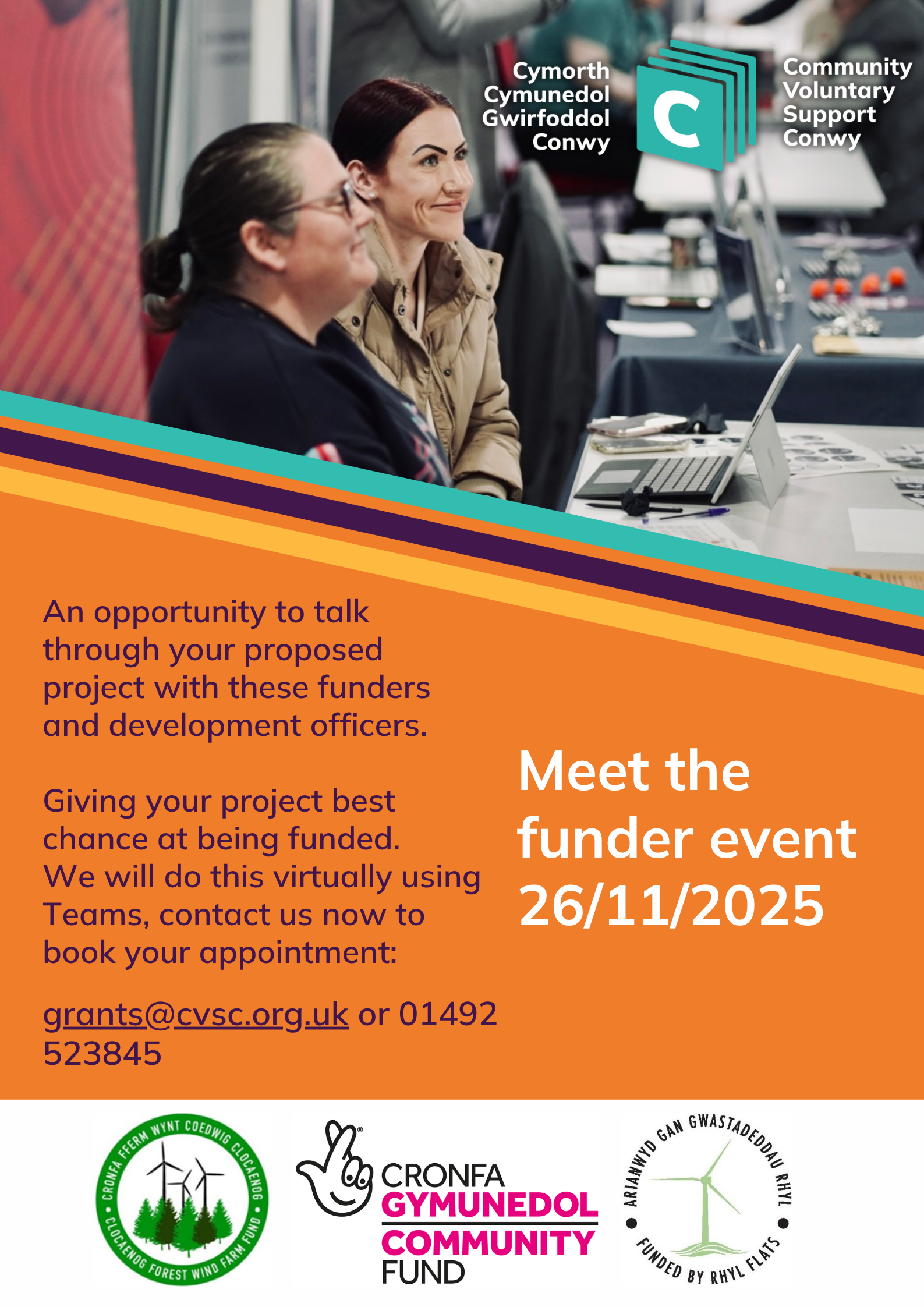 Am ragor o wybodaeth, cysylltwch! Ar e-bost philipjones@cvsc.org.uk neu dros y ffôn ar 01492 523843 | Funding News BriefAs well as the numerous grants that CVSC administer, we also have a Sustainable Funding Officer who can assist groups within Conwy who may not be eligible for our own grant funds or are looking for match funding. Our Funding Officer